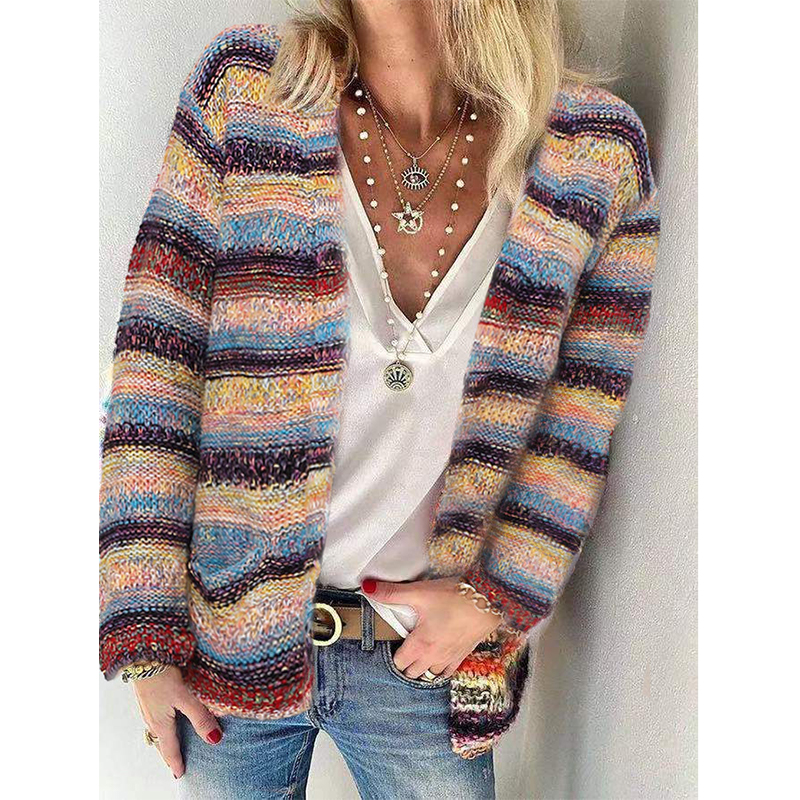 Long Sleeve Casual Rainbow Striped Sweater Jacket